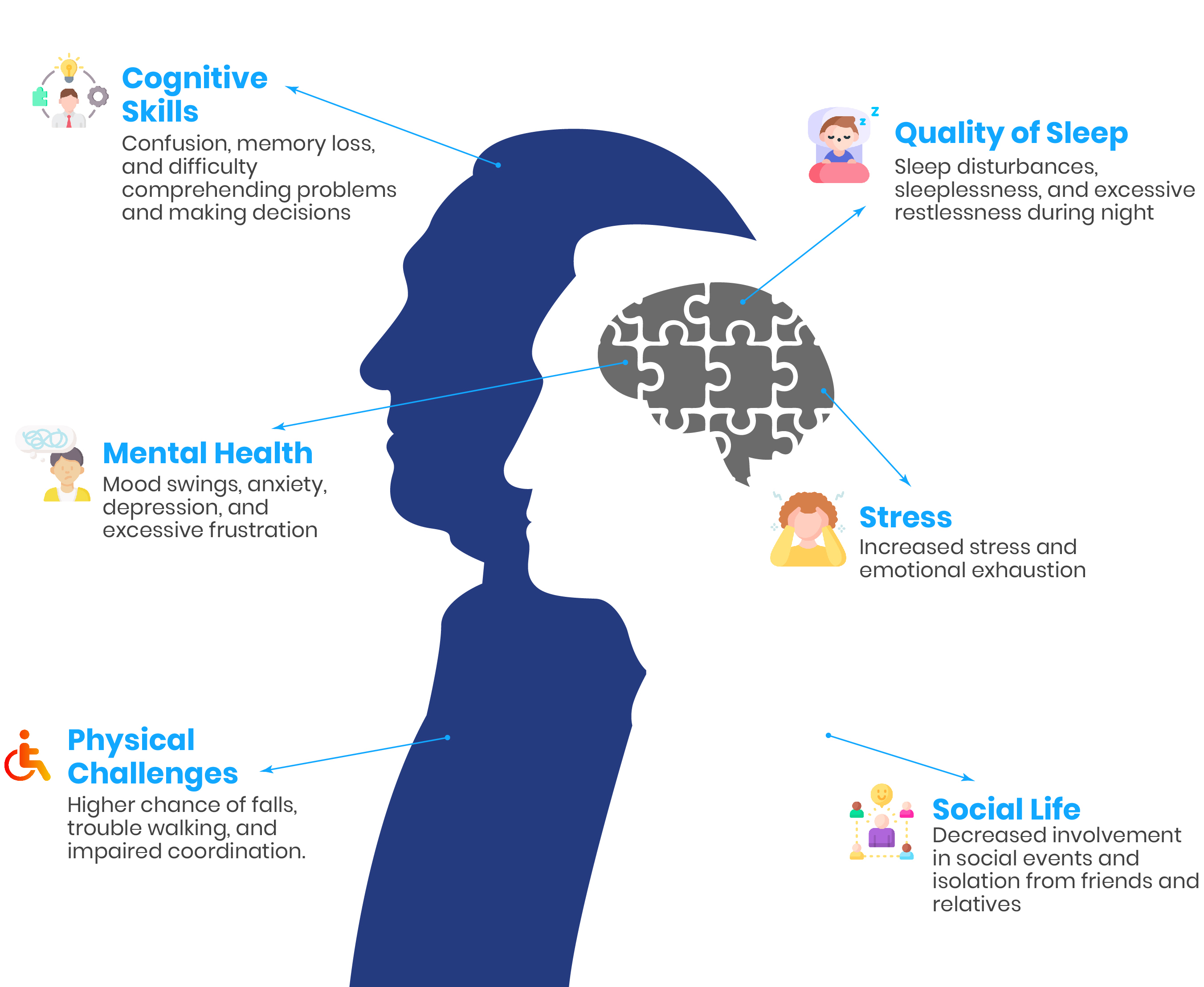 Alzheimer's has its major impact on memory and cognitive function, resulting in severe impairments in activities of daily living. Physically, it may result in coordination and mobility challenges. Emotional breakdowns, confusion, frustration, and mood swings are also associated with this disorder. Sensory processing may be impaired, resulting in failure to adapt in the environment.